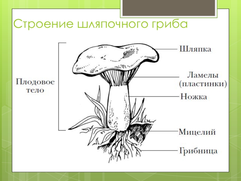 1. Ознакомиться со строением типичного шляпочного гриба. Определить основные элементы его строения. Зарисовать рисунок в тетрадь, обозначить: шляпку, ножку, мицелий, гифы.