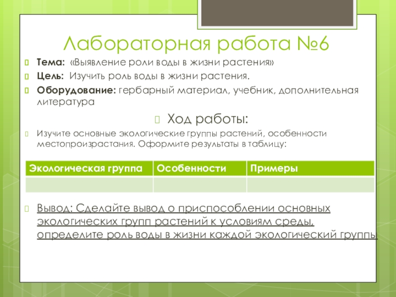 Вывод: Сделайте вывод о приспособлении основных экологических групп растений к условиям среды, определите роль воды в жизни каждой экологический группы