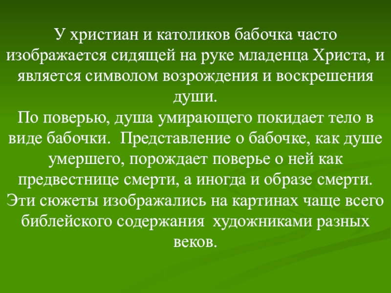 Слайд 10У христиан и католиков бабочка часто изображается сидящей на руке младенца