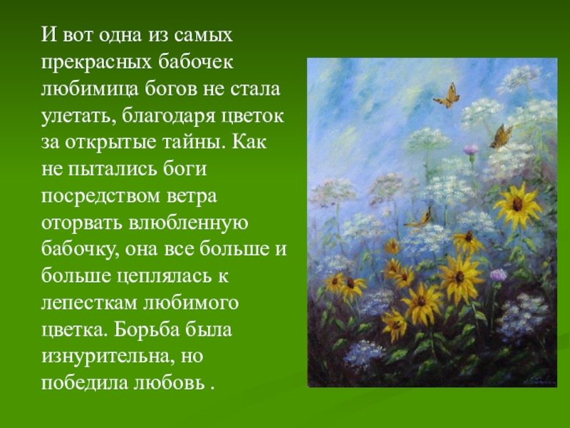 улетать, благодаря цветок за открытые тайны. Как не пытались боги посредством ветра оторвать влюбленную бабочку, она все больше и больше цеплялась к лепесткам любимого цветка. Борьба была изнурительна, но победила любовь .