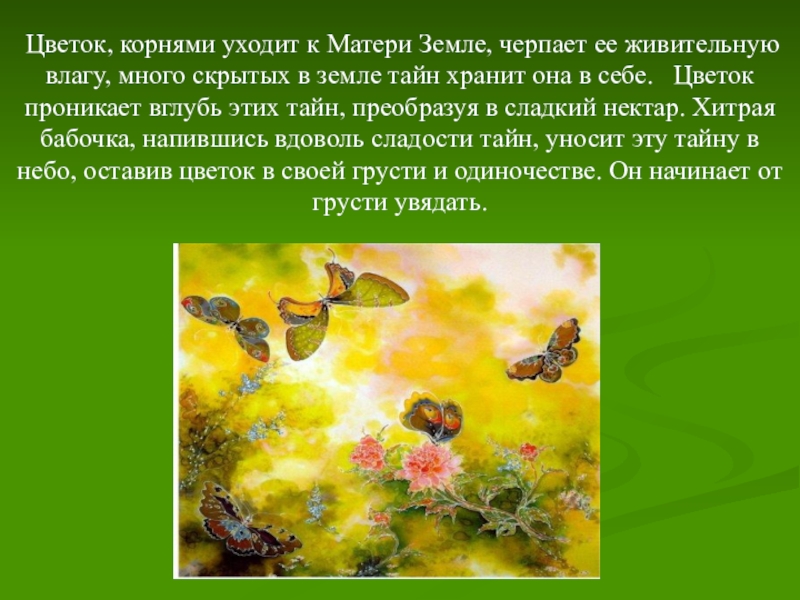 много скрытых в земле тайн хранит она в себе. Цветок проникает вглубь этих тайн, преобразуя в сладкий нектар. Хитрая бабочка, напившись вдоволь сладости тайн, уносит эту тайну в небо, оставив цветок в своей грусти и одиночестве. Он начинает от грусти увядать.