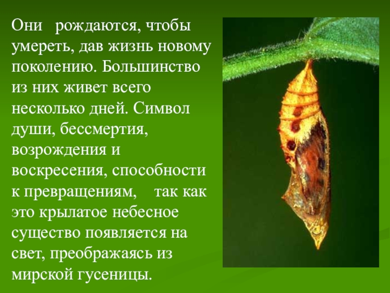 них живет всего несколько дней. Символ души, бессмертия, возрождения и воскресения, способности к превращениям, так как это крылатое небесное существо появляется на свет, преображаясь из мирской гусеницы.