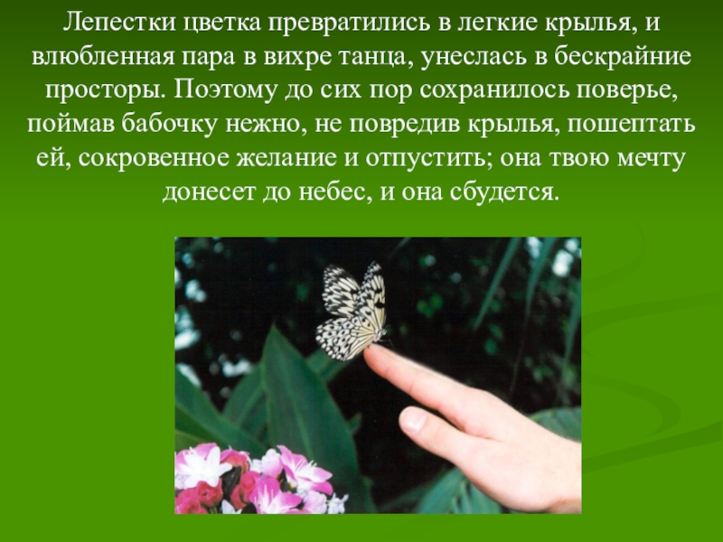 танца, унеслась в бескрайние просторы. Поэтому до сих пор сохранилось поверье, поймав бабочку нежно, не повредив крылья, пошептать ей, сокровенное желание и отпустить; она твою мечту донесет до небес, и она сбудется.