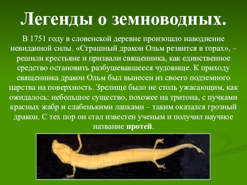 силы. «Страшный дракон Ольм резвится в горах», – решили крестьяне и призвали священника, как единственное средство остановить разбушевавшееся чудовище. К приходу священника дракон Ольм был вынесен из своего подземного царства на поверхность. Зрелище было не столь ужасающим, как ожидалось: небольшое существо, похожее на тритона, с пучками красных жабр и слабенькими лапками – таким оказался грозный дракон. С тех пор он стал известен ученым и получил научное название протей.