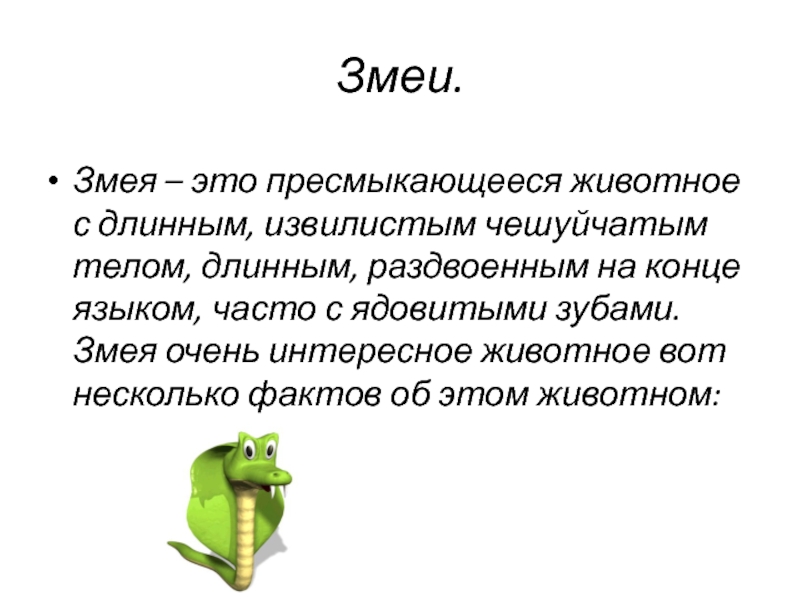 Змеи.Змея – это пресмыкающееся животное с длинным, извилистым чешуйчатым телом, длинным, раздвоенным на конце языком, часто с ядовитыми зубами. Змея очень интересное животное вот несколько фактов об этом животном:
