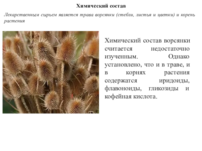 Химический состав ворсянки считается недостаточно изученным. Однако установлено, что и