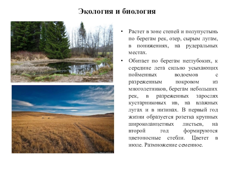 Обитает по берегам неглубоких, к середине лета сильно усыхающих пойменных водоемов с разреженным покровом из многолетников, берегам небольших рек, в разреженных зарослях кустарниковых ив, на влажных лугах и в низинах. В первый год жизни образуется розетка крупных широколанцетных листьев, на второй год формируются цветоносные стебли. Цветет в июле. Размножение семенное.