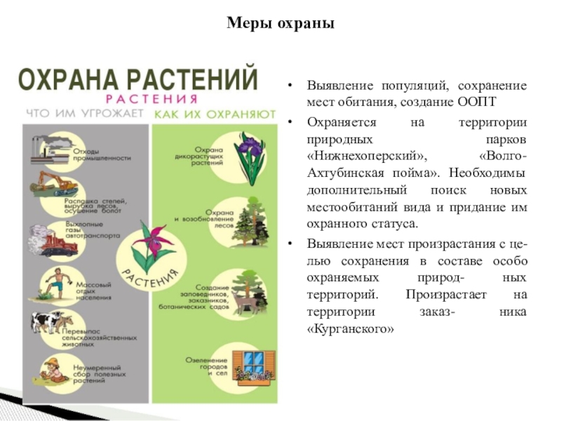 Выявление мест произрастания с це- лью сохранения в составе особо охраняемых природ- ных территорий. Произрастает на территории заказ- ника «Курганского»