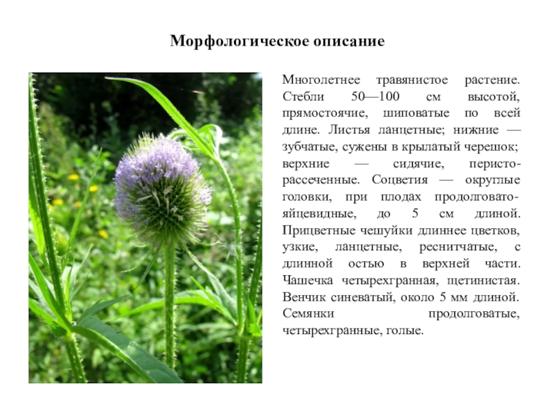 всей длине. Листья ланцетные; нижние — зубчатые, сужены в крылатый черешок; верхние — сидячие, перисто-рассеченные. Соцветия — округлые головки, при плодах продолговато-яйцевидные, до 5 см длиной. Прицветные чешуйки длиннее цветков, узкие, ланцетные, реснитчатые, с длинной остью в верхней части. Чашечка четырехгранная, щетинистая. Венчик синеватый, около 5 мм длиной. Семянки продолговатые, четырехгранные, голые.