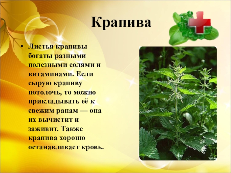 потолочь, то можно прикладывать её к свежим ранам — она их вычистит и заживит. Также крапива хорошо останавливает кровь.