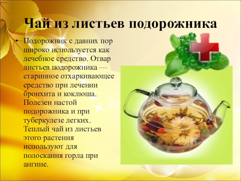 средство. Отвар листьев подорожника — старинное отхаркивающее средство при лечении бронхита и коклюша. Полезен настой подорожника и при туберкулезе легких. Теплый чай из листьев этого растения используют для полоскания горла при ангине.