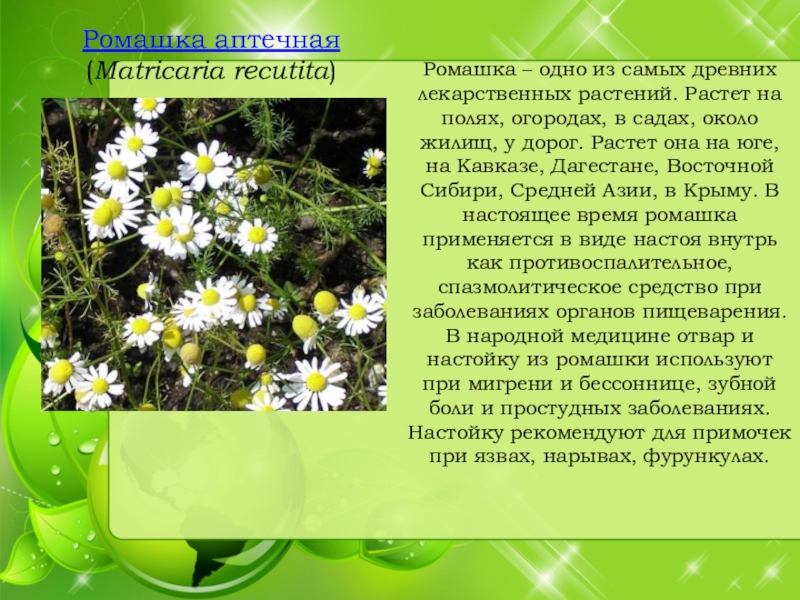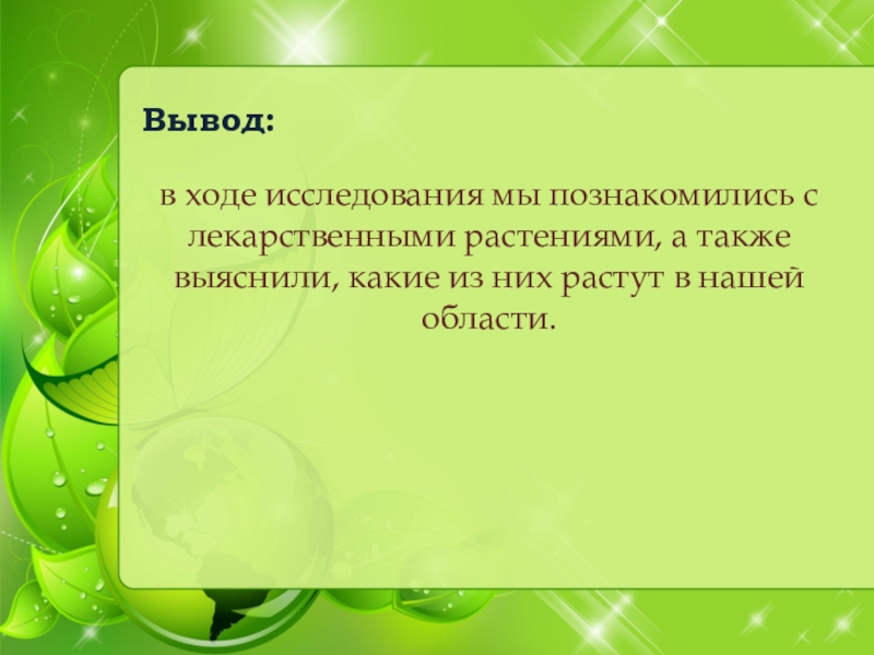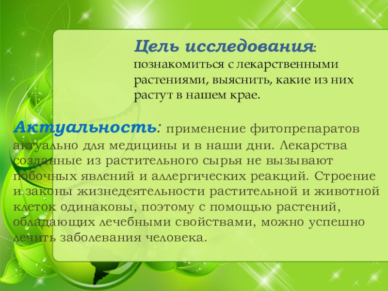Актуальность: применение фитопрепаратов актуально для медицины и в наши дни. Лекарства созданные из растительного сырья не вызывают побочных явлений и аллергических реакций. Строение и законы жизнедеятельности растительной и животной клеток одинаковы, поэтому с помощью растений, обладающих лечебными свойствами, можно успешно лечить заболевания человека.
