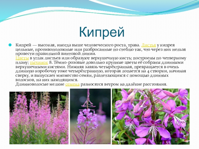 Кипрей — высокая, иногда выше человеческого роста, трава. Листья у кипрея цельные, противоположные или разбросанные по стеблю так, что через них нельзя провести правильной винтовой линии.