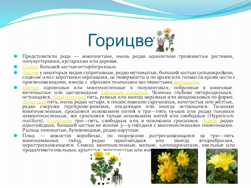 Цветки пятилепестковые, не совсем правильные, чаще всего жёлтые, но также встречаются оранжевые, красно-коричневые, голубые, пурпурные и белые. Венчик правильный или почти правильный[5], плоский, колесовидный, три части короче и снабжены шершавыми нитями, остальные голые. Венчик с очень короткой, малозаметной трубкой и пятилопастным отгибом, слегка вогнутым или почти плоским[5]; тычинок пять или четыре (у немногих видов пятая (задняя) тычинка не развивается[5]), с опушёнными нитями. Пыльники всех тычинок одинаковые или же у двух передних тычинок продолговато-линейные, низбегающие на тычиночную нить; столбик нитевидный или же утолщённый к верхушке; завязь двугнёздная, обыкновенно со многими семяпочками. Цветки в пучках или одиночные, образующие простое, кистевидное или же ветвистое метельчатое соцветие[5].