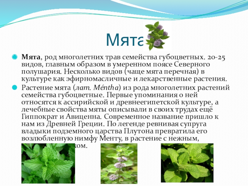 Растение мята (лат. Méntha) из рода многолетних растений семейства губоцветные. Первые упоминания о ней относятся к ассирийской и древнеегипетской культуре, а лечебные свойства мяты описывали в своих трудах ещё Гиппократ и Авиценна. Современное название пришло к нам из Древней Греции. По легенде ревнивая супруга владыки подземного царства Плутона превратила его возлюбленную нимфу Менту, в растение с нежным, холодным запахом.