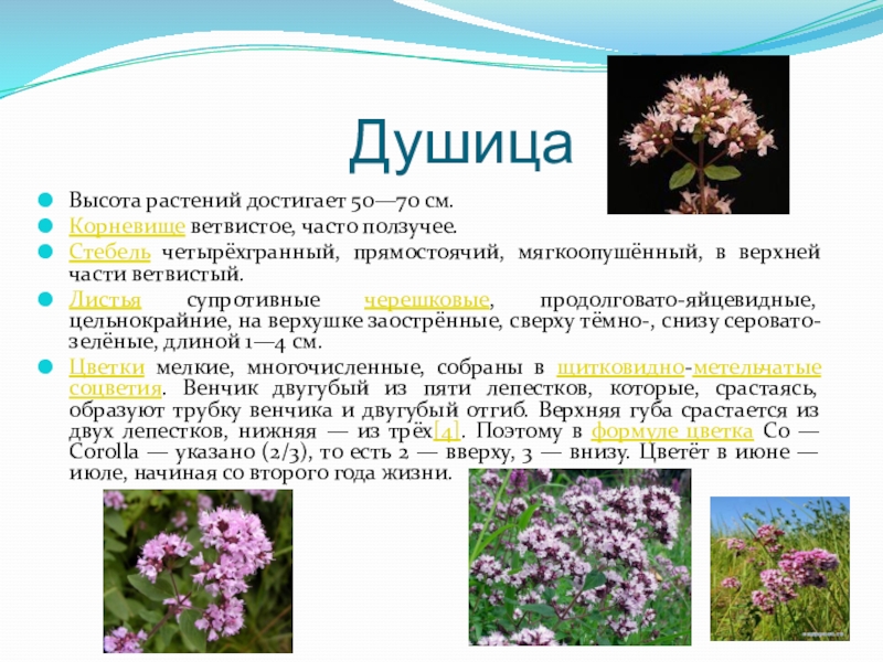 Цветки мелкие, многочисленные, собраны в щитковидно-метельчатые соцветия. Венчик двугубый из пяти лепестков, которые, срастаясь, образуют трубку венчика и двугубый отгиб. Верхняя губа срастается из двух лепестков, нижняя — из трёх[4]. Поэтому в формуле цветка Co — Corolla — указано (2/3), то есть 2 — вверху, 3 — внизу. Цветёт в июне — июле, начиная со второго года жизни.