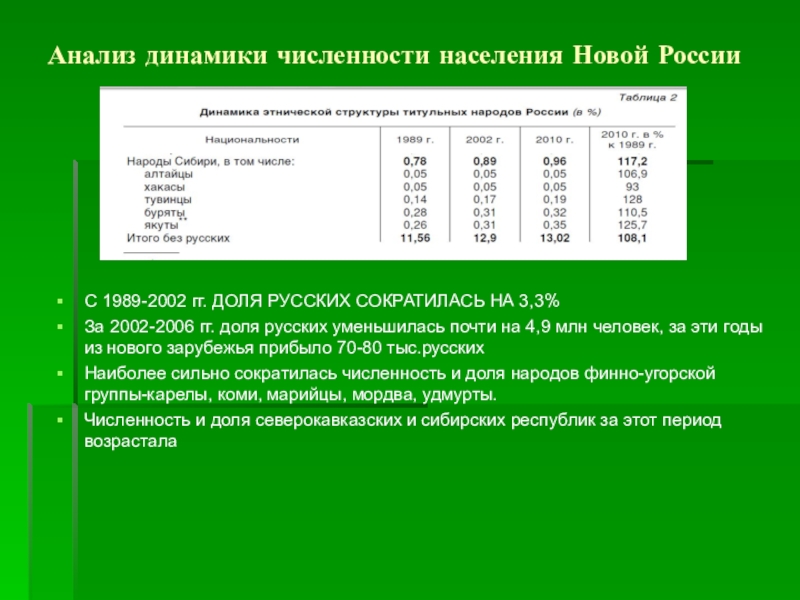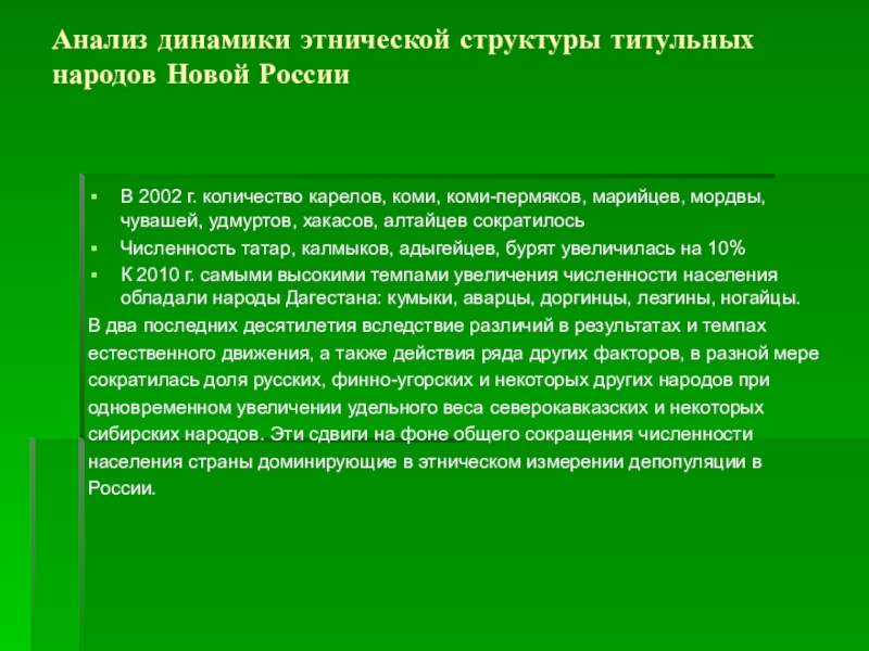Слайд 10Анализ динамики этнической структуры титульных народов Новой России