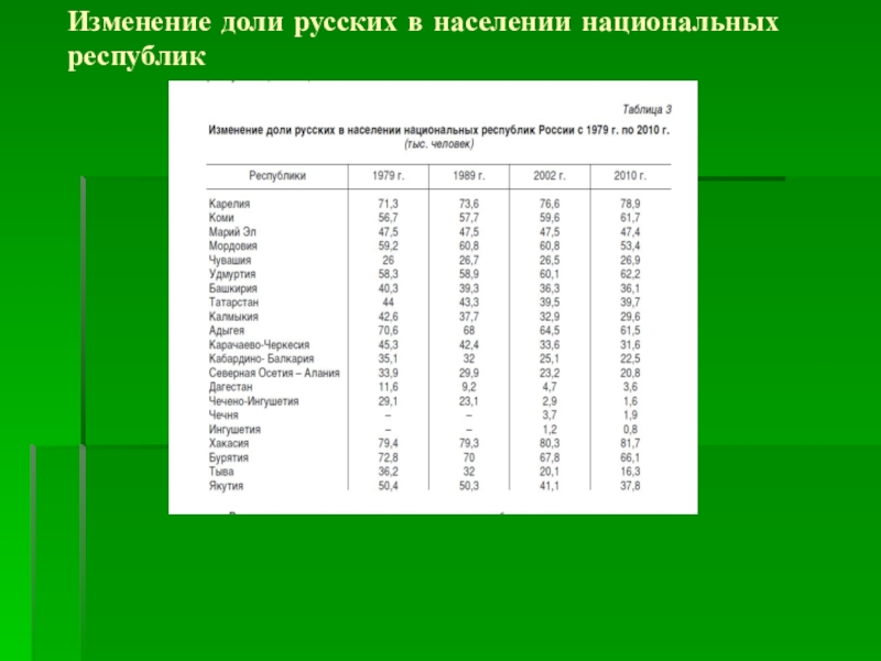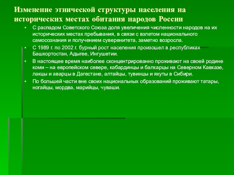 Доля русского населения в сибирских республиках, Башкортостане, Татарстане, северокавказских республиках (Адыгее, Калмыкии, Карачаево-Черкесии, Кабардино-Балкарии, Северной Осетии) в этнических структурах значительно сократилась.