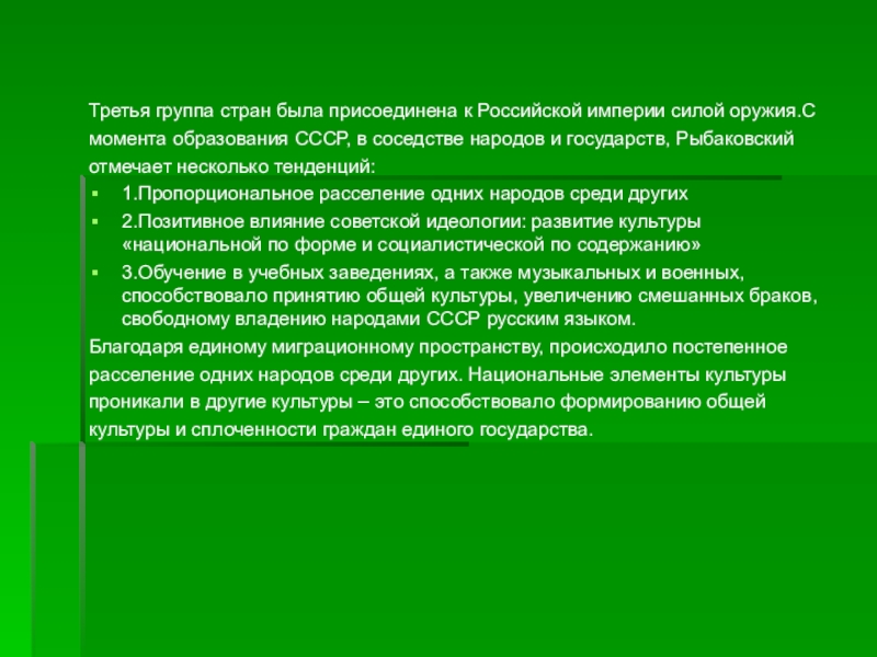 3.Обучение в учебных заведениях, а также музыкальных и военных, способствовало принятию общей культуры, увеличению смешанных браков, свободному владению народами СССР русским языком.