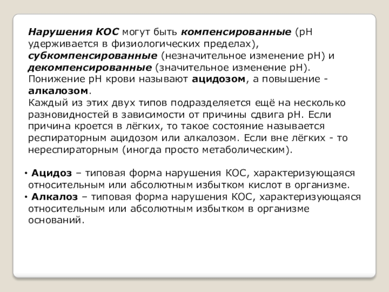 Слайд 31Нарушения КОС могут быть компенсированные (рН удерживается в физиологических пределах), субкомпенсированные