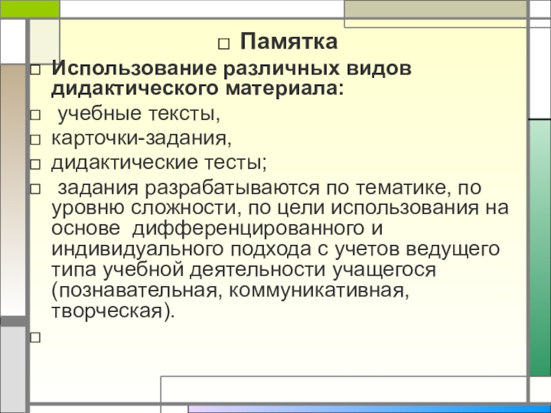 задания разрабатываются по тематике, по уровню сложности, по цели использования на основе дифференцированного и индивидуального подхода с учетов ведущего типа учебной деятельности учащегося (познавательная, коммуникативная, творческая).