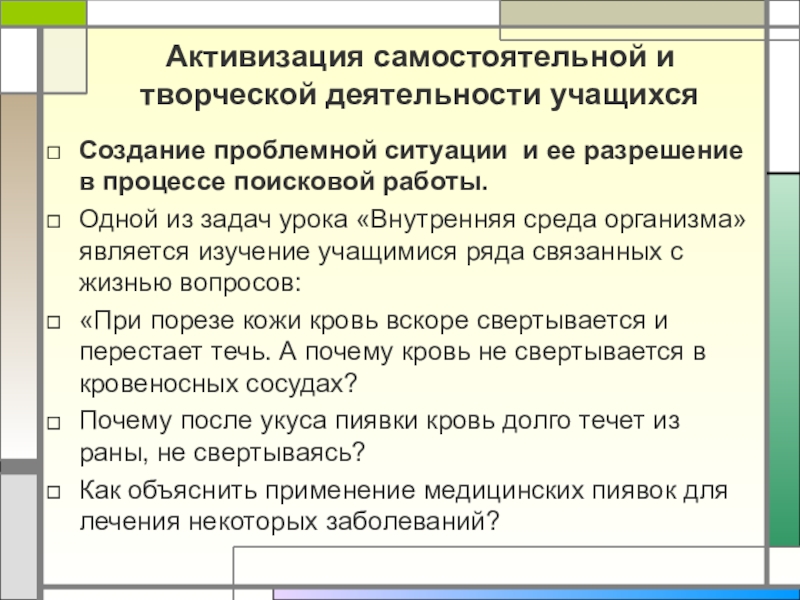 Одной из задач урока «Внутренняя среда организма» является изучение учащимися ряда связанных с жизнью вопросов: