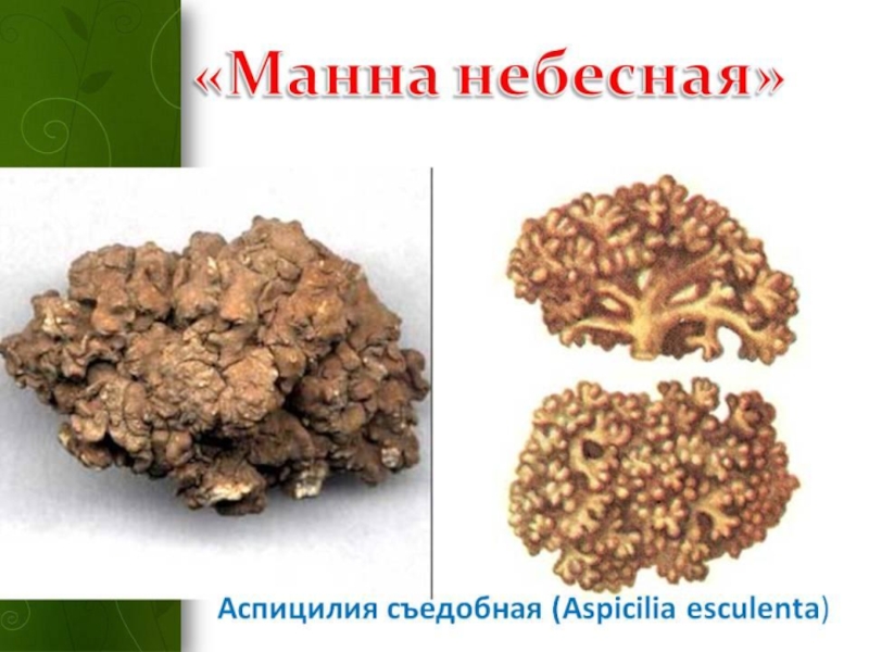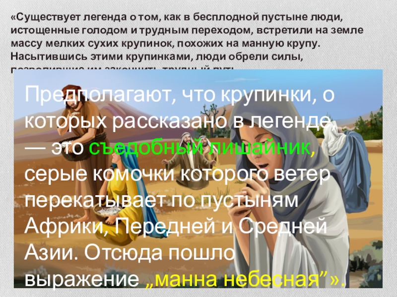 Предполагают, что крупинки, о которых рассказано в легенде, ― это съедобный лишайник, серые комочки которого ветер перекатывает по пустыням Африки, Передней и Средней Азии. Отсюда пошло выражение „манна небесная”».