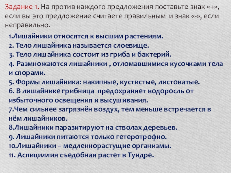 Задание 1. На против каждого предложения поставьте знак «+», если вы это предложение считаете правильным и знак «-», если неправильно.