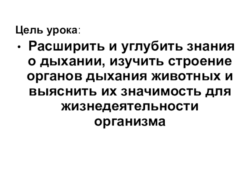 Цель урока: Расширить и углубить знания о дыхании, изучить строение органов дыхания животных и выяснить их значимость