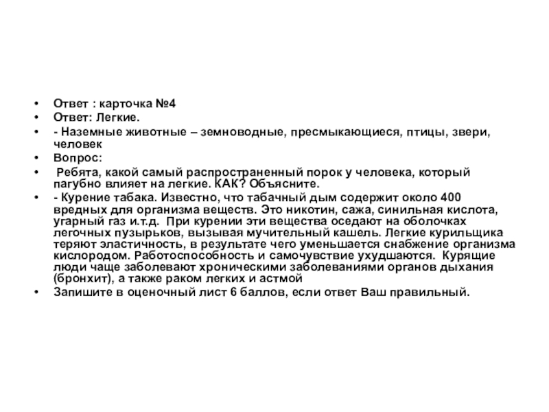 Ответ : карточка №4Ответ: Легкие.- Наземные животные – земноводные, пресмыкающиеся, птицы, звери, человекВопрос: Ребята, какой самый распространенный