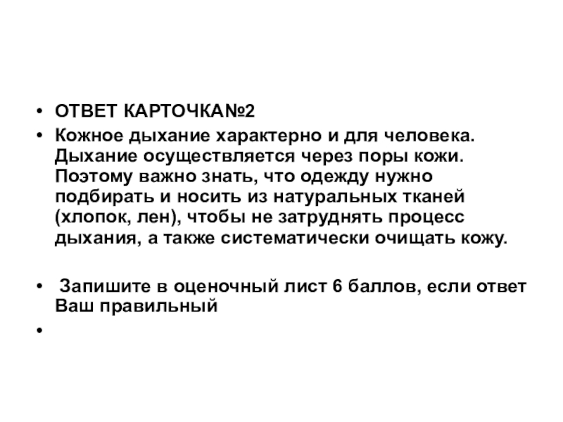 ОТВЕТ КАРТОЧКА№2Кожное дыхание характерно и для человека. Дыхание осуществляется через поры кожи. Поэтому важно знать, что одежду