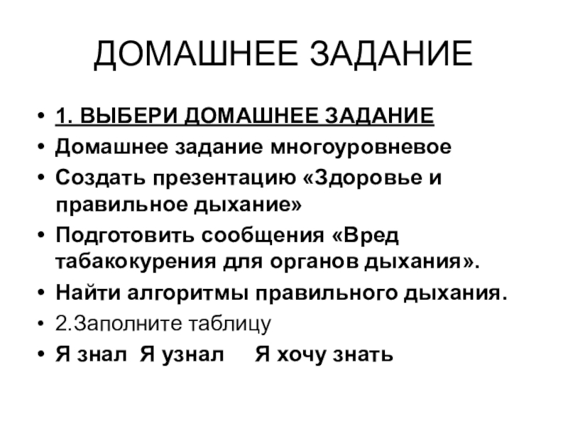 ДОМАШНЕЕ ЗАДАНИЕ1. ВЫБЕРИ ДОМАШНЕЕ ЗАДАНИЕДомашнее задание многоуровневоеСоздать презентацию «Здоровье и правильное дыхание»Подготовить сообщения «Вред табакокурения для органов