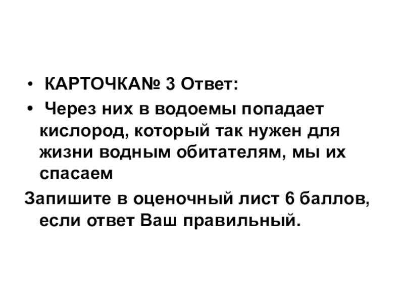 КАРТОЧКА№ 3 Ответ: Через них в водоемы попадает кислород, который так нужен для жизни водным обитателям,