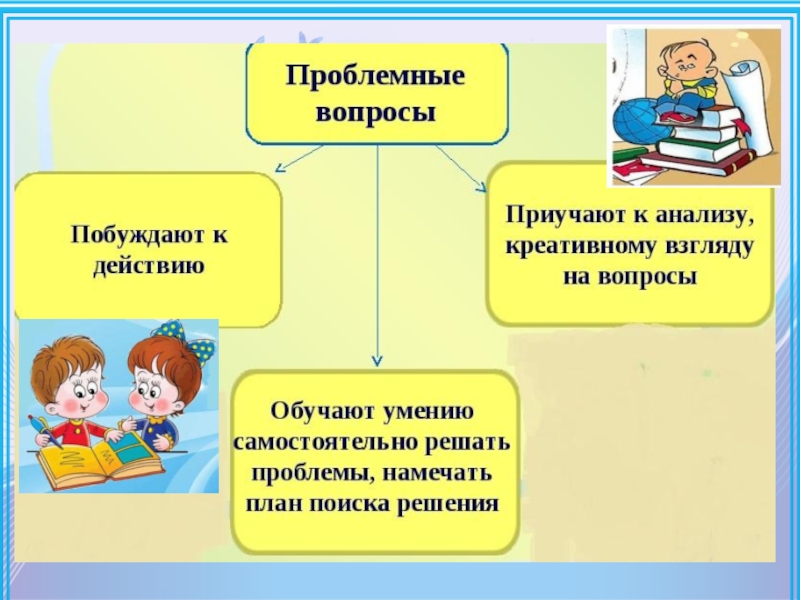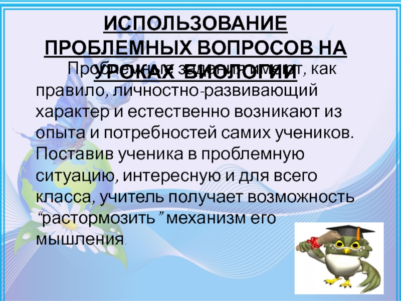 имеют, как правило, личностно-развивающий характер и естественно возникают из опыта и потребностей самих учеников. Поставив ученика в проблемную ситуацию, интересную и для всего класса, учитель получает возможность “растормозить” механизм его мышления.