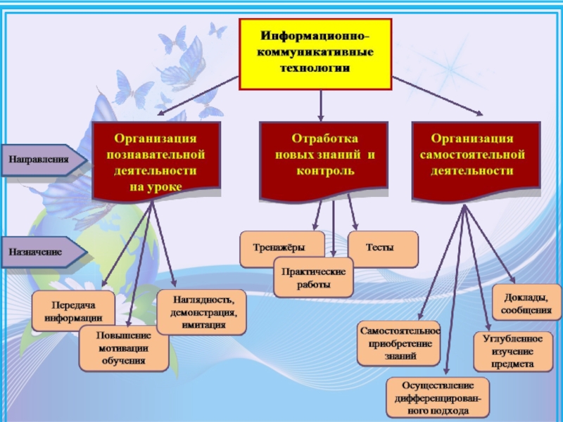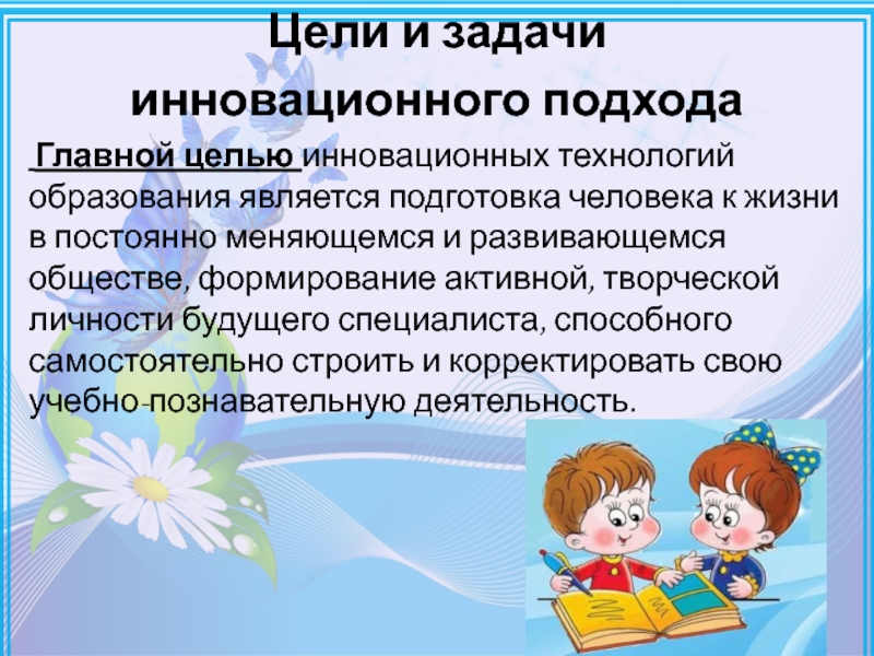 претерпевает кардинальные изменения. В классической триаде целей учителя на первое место выходят развивающие и социализирующие цели. А само предметное содержание, уступив целевую функцию способам действий, получает новую роль – средства запуска и поддержания процессов саморазвития и самопознания ученика. Решение этой задачи возможно благодаря применению инновационных технологий обучения.