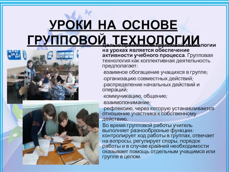 Во время групповой работы учитель выполняет разнообразные функции: контролирует ход работы в группах, отвечает на вопросы, регулирует споры, порядок работы и в случае крайней необходимости оказывает помощь отдельным учащимся или группе в целом.