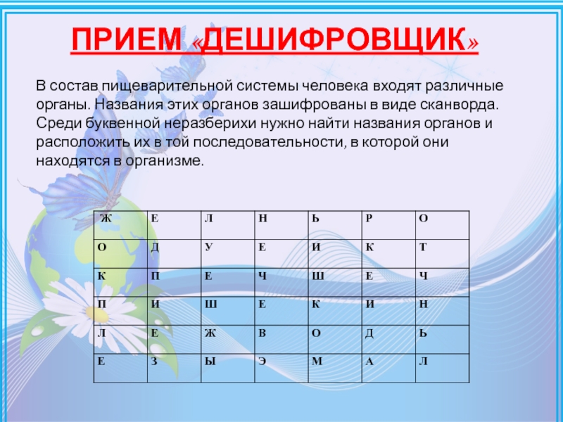 органов зашифрованы в виде сканворда. Среди буквенной неразберихи нужно найти названия органов и расположить их в той последовательности, в которой они находятся в организме.