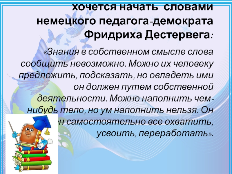 Слайд 2Сегодняшний мастер-класс мне хочется начать словами немецкого педагога-демократа Фридриха Дестервега: