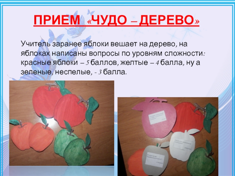 написаны вопросы по уровням сложности: красные яблоки – 5 баллов, желтые – 4 балла, ну а зеленые, неспелые, - 3 балла.