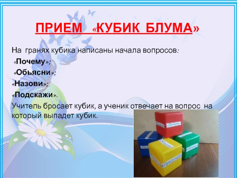 Учитель бросает кубик, а ученик отвечает на вопрос на который выпадет кубик.