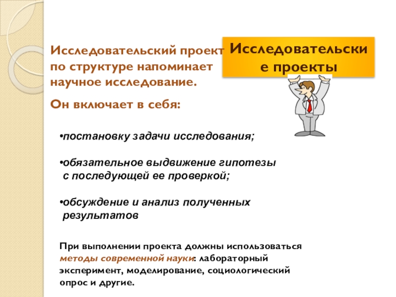 При выполнении проекта должны использоваться методы современной науки: лабораторный эксперимент, моделирование, социологический опрос и другие.