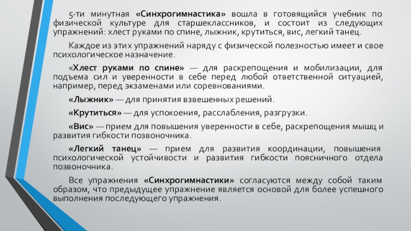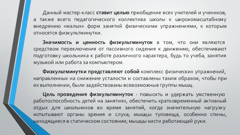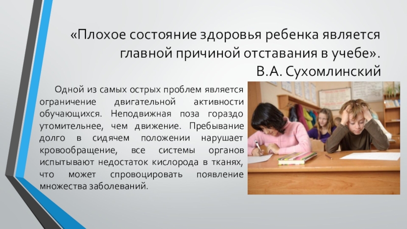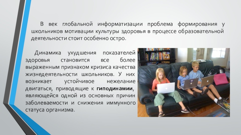 Динамика ухудшения показателей здоровья становится все более выраженным признаком кризиса качества жизнедеятельности школьников. У них возникает устойчивое нежелание двигаться, приводящие к гиподинамии, являющейся одной из основных причин заболеваемости и снижения иммунного статуса организма.