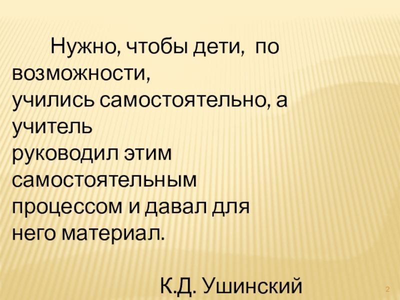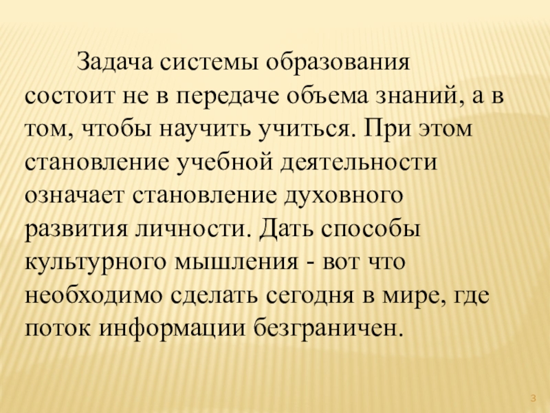 Задача системы образования состоит не в передаче объема знаний, а в том, чтобы научить учиться. При этом становление учебной деятельности означает становление духовного развития личности. Дать способы культурного мышления - вот что необходимо сделать сегодня в мире, где поток информации безграничен.