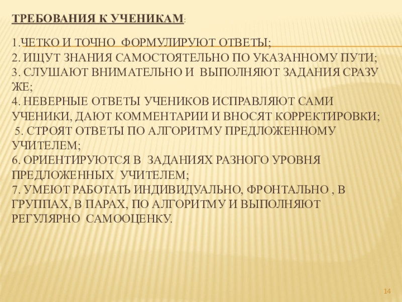 7. умеют работать индивидуально, фронтально , в группах, в парах, по алгоритму и выполняют регулярно самооценку.