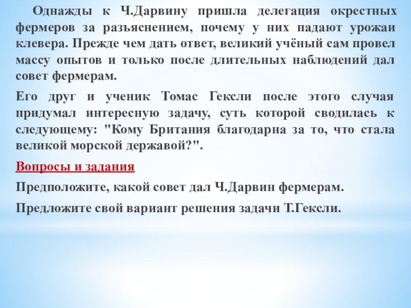 Слайд 19 Однажды к Ч.Дарвину пришла делегация окрестных фермеров за разъяснением, почему