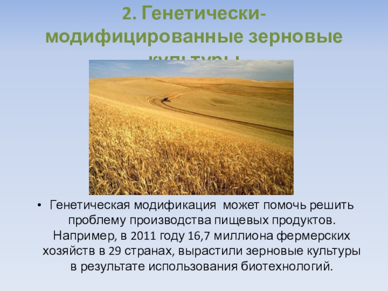 Слайд 32. Генетически-модифицированные зерновые культуры