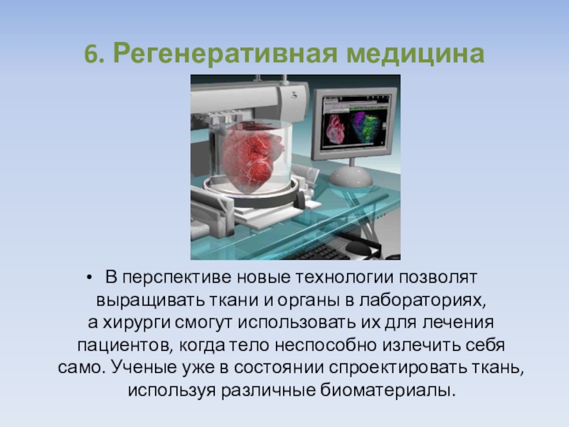 6. Регенеративная медицинаВ перспективе новые технологии позволят выращивать ткани и органы в лабораториях, а хирурги смогут использовать их для