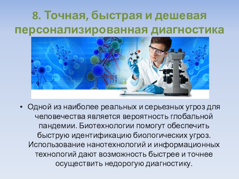 8. Точная, быстрая и дешевая персонализированная диагностикаОдной из наиболее реальных и серьезных угроз для человечества является вероятность