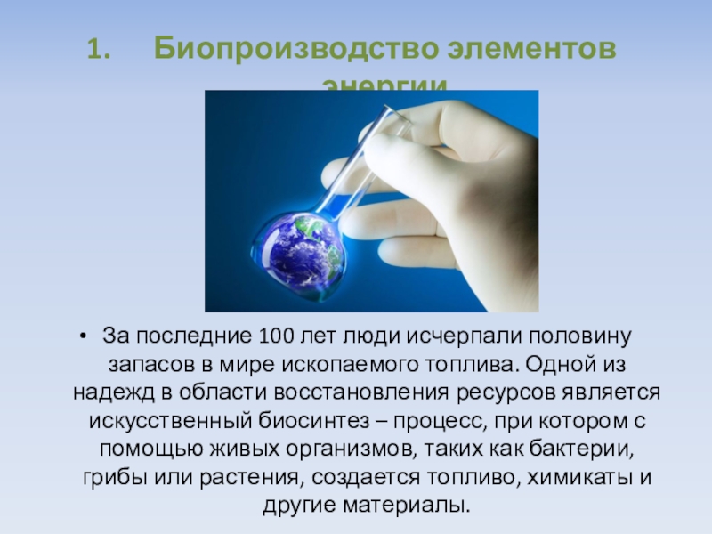 Биопроизводство элементов энергииЗа последние 100 лет люди исчерпали половину запасов в мире ископаемого топлива. Одной из надежд