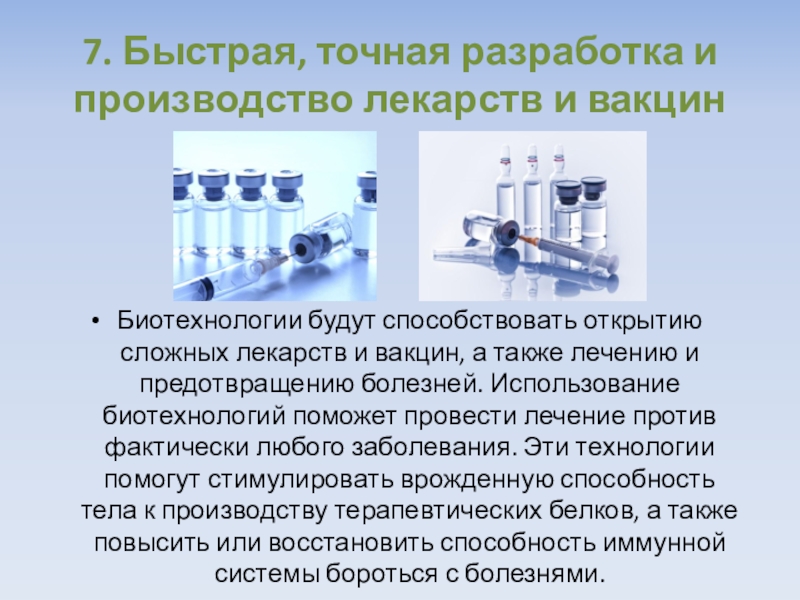 7. Быстрая, точная разработка и производство лекарств и вакцинБиотехнологии будут способствовать открытию сложных лекарств и вакцин, а